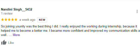 “I had a great experience during my 1st and amazing internship opportunity with YOUNITY. This platform is really awesome for the students. It helped me enhancing my communication skill as well as in increasing confidence level. It provides us with different courses given by the experienced mentors. I loved the service of YOUNITY.”